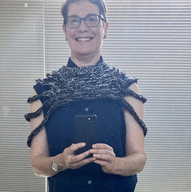 Here is a recent knitting project I did. I call it my strangled octopus! It was a lot of fun and I’m looking forward to how it will enliven my winter wardrobe. It can also be rotated like a poncho and worn with arms in the holes.